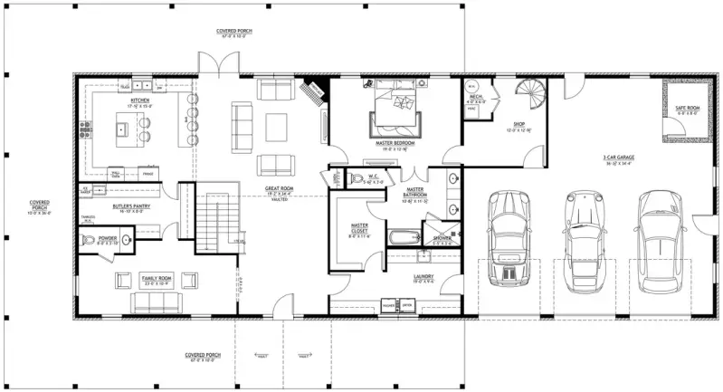 - Built-in utility, security, and workspace without sacrificing square footage with the shop, mechanical room, and safe room all in the garage.